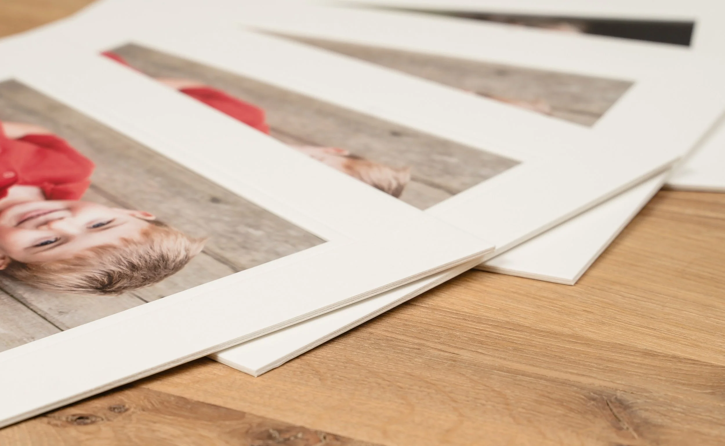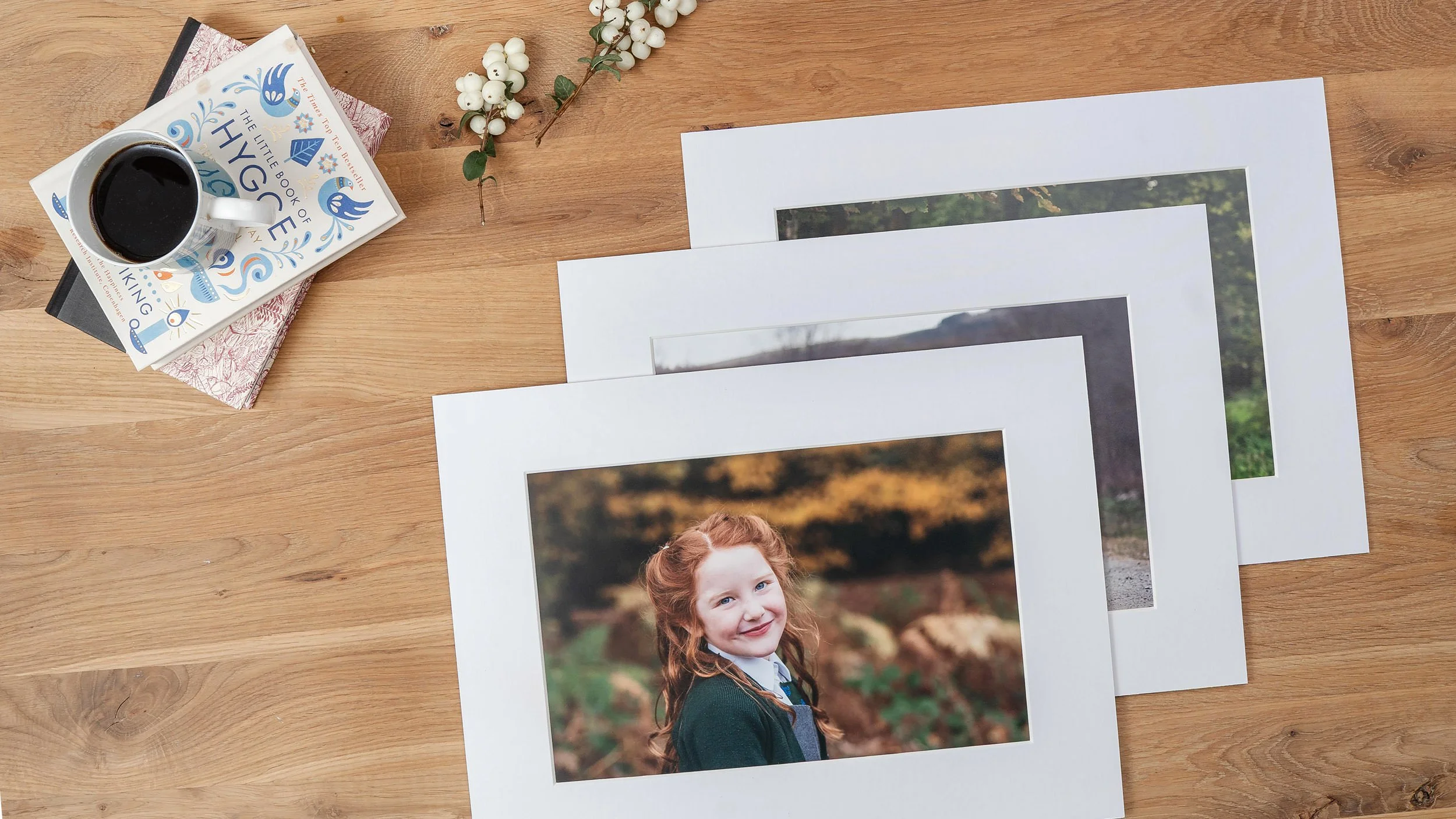 luxury mounted photo prints, white card school photos, on table with coffee and books